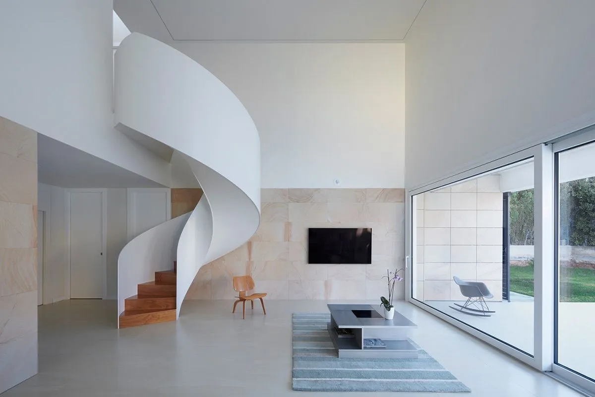 Além de funcional, a escada helicoidal adiciona sofisticação e dinamismo aos interiores, valorizando cada metro quadrado do imóvel.